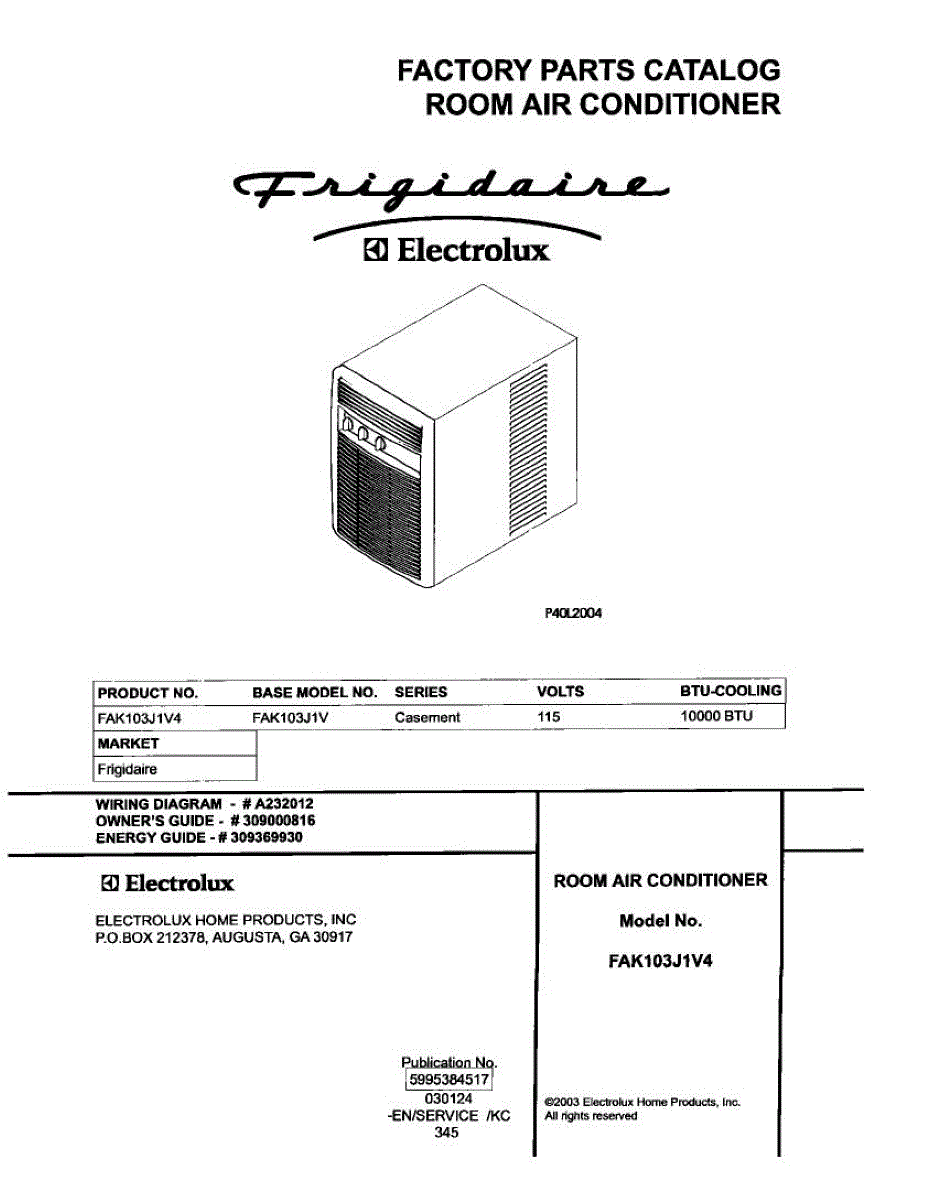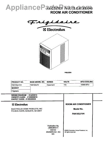 Parts for Frigidaire FAK103J1V4: 01 - Cover Parts