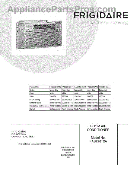 Parts for Frigidaire FAS226T2A12: 01 - Cover Parts