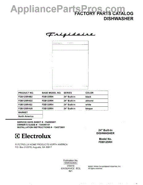 Parts for Frigidaire FDB125RHS2: 01 - Cover Parts