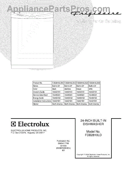 Parts for Frigidaire FDB2810LDS0: 01 - Cover Parts