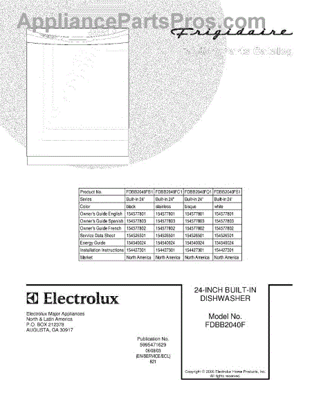 Parts for Frigidaire FDBB2040FQ1: 01 - Cover Parts
