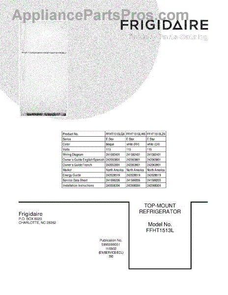 Parts for Frigidaire FFHT1513LZ6: 01 - Cover Parts