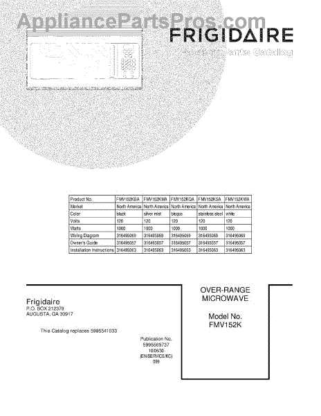 Parts for Frigidaire FMV152KWA: 01 - Cover Parts