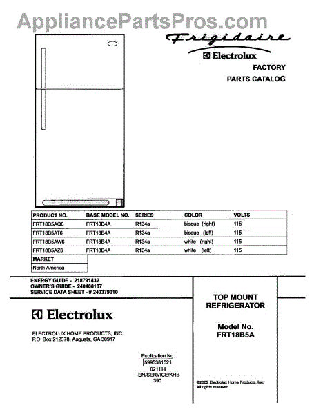 Parts for Frigidaire FRT18B5AZ6: 01 - Cover Parts