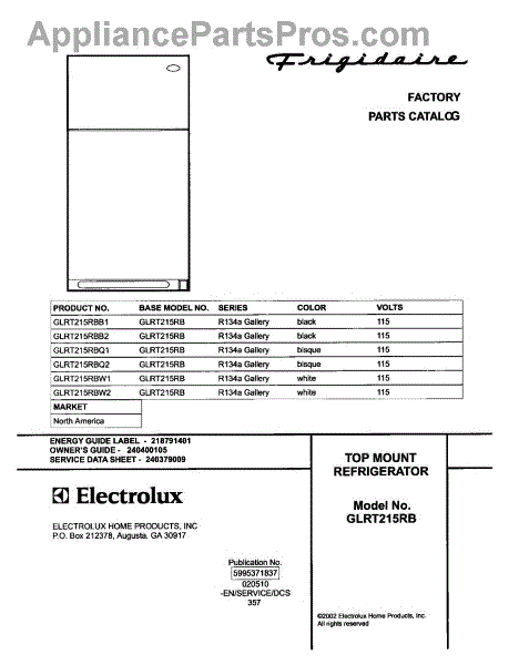 Parts for Frigidaire GLRT215RBB1: 01 - Cover Parts
