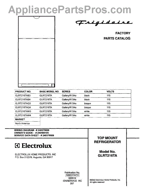 Parts for Frigidaire GLRT216TAW4: 01 - Cover Parts