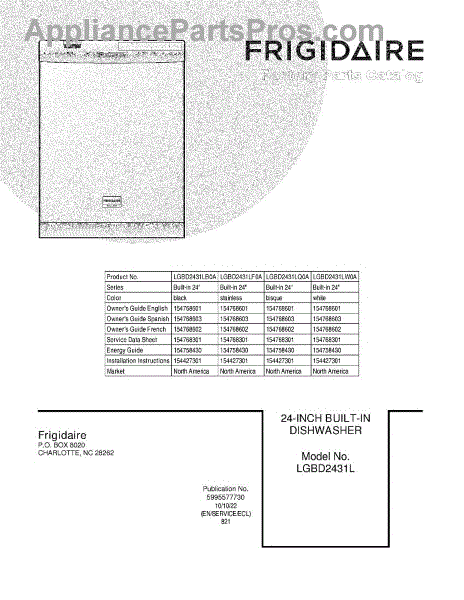 Parts for Frigidaire LGBD2431LF0A: 01 - Cover Parts