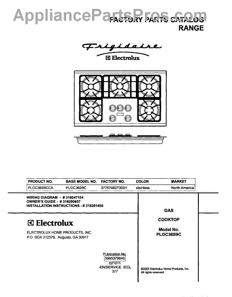Parts for Frigidaire PLGC36S9CCA: 01 - Cover Parts