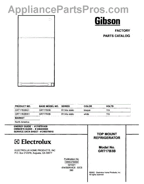 Parts for Gibson GRT17B3BW1: 01 - Cover Parts