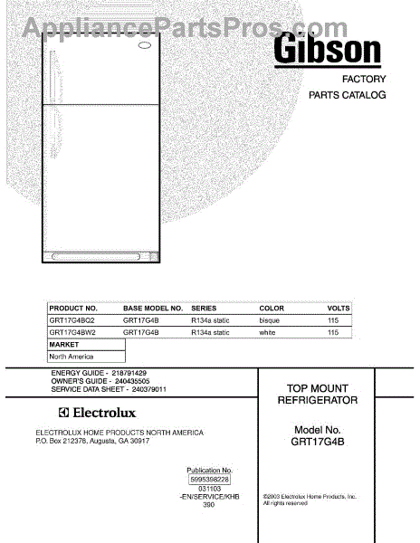 Parts for Gibson GRT17G4BW2: 01 - Cover Parts