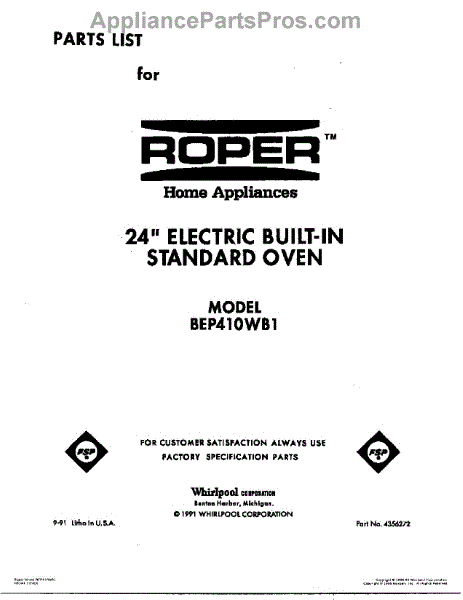 Parts for Roper BEP410WB1: 01 - Cover Parts