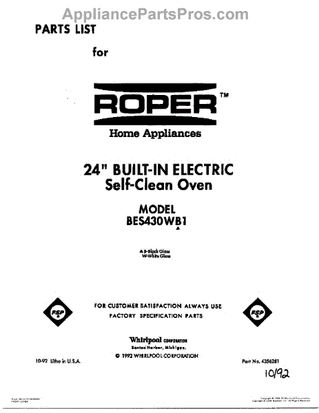 Parts for Roper BES430WW1: 01 - Cover Parts