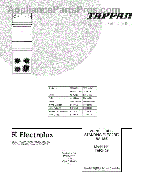 Parts for Tappan TEF242BW2: 01 - Cover Parts