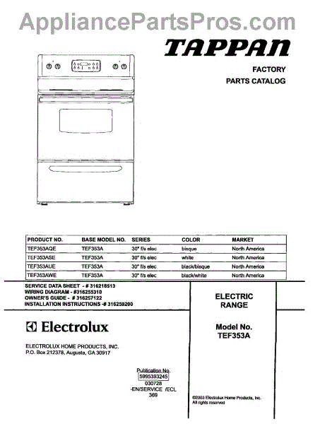 Parts for Tappan TEF353AQE: 01 - Cover Parts