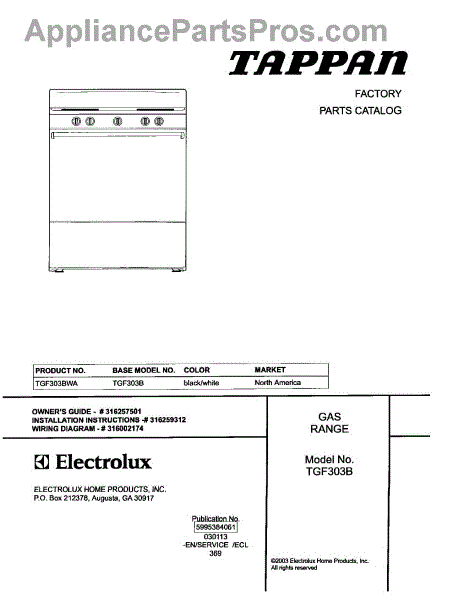 Parts for Tappan TGF303BWA: 01 - Cover Parts