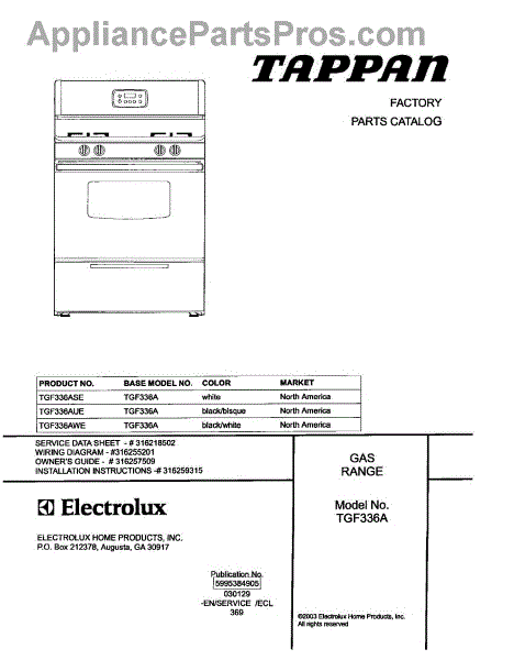 Parts for Tappan TGF336AWE: 01 - Cover Parts