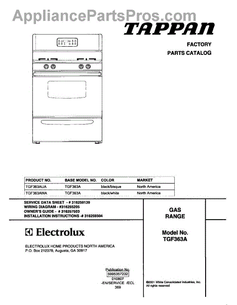 Parts for Tappan TGF363AWA: 01 - Cover Parts