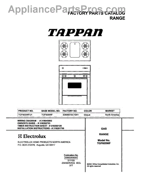 Parts for Tappan TGF605WFU1: 01 - Cover Parts