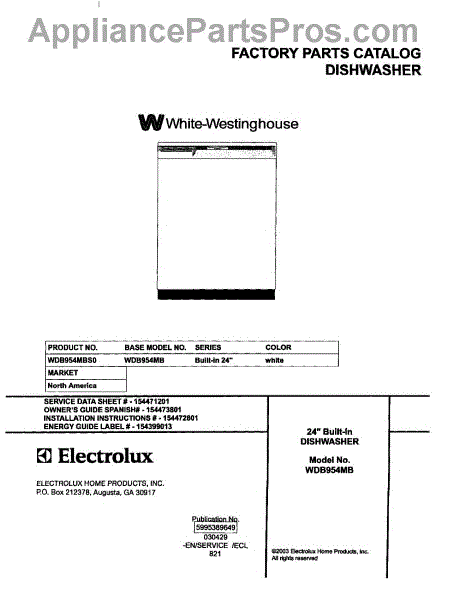 Parts for White Westinghouse WDB954MBS0: 01 - Cover Parts