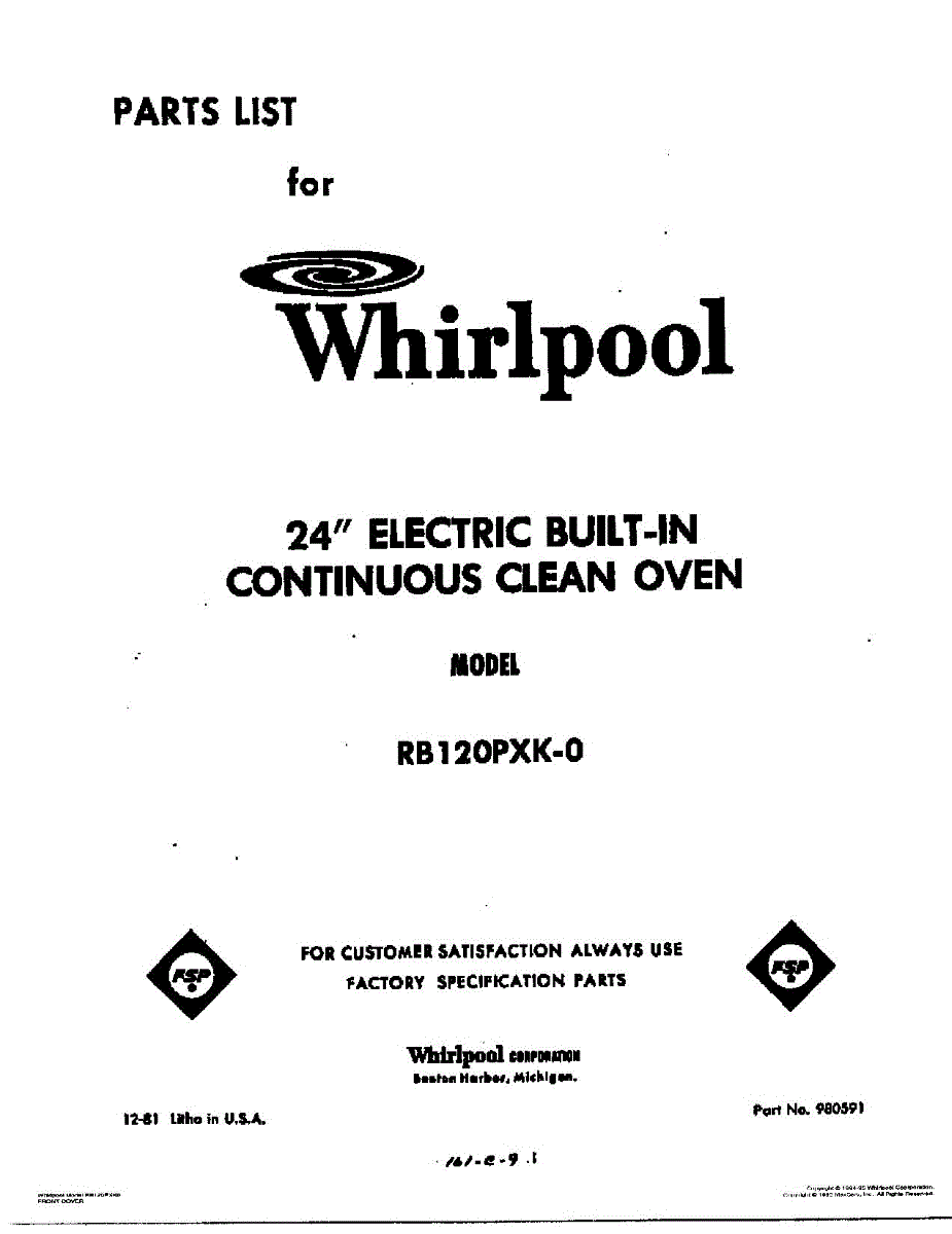 Parts for Whirlpool RB120PXK0: 01 - Cover Parts