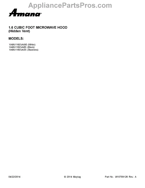 Parts for Amana YAMV1160VAS5: 01 - Cover Sheet Parts