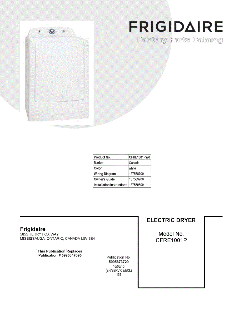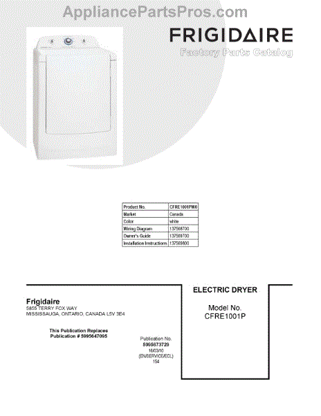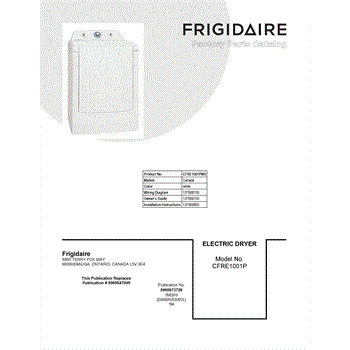 Parts for Frigidaire CFRE1001PW0: 01 - Cover Sheet Parts