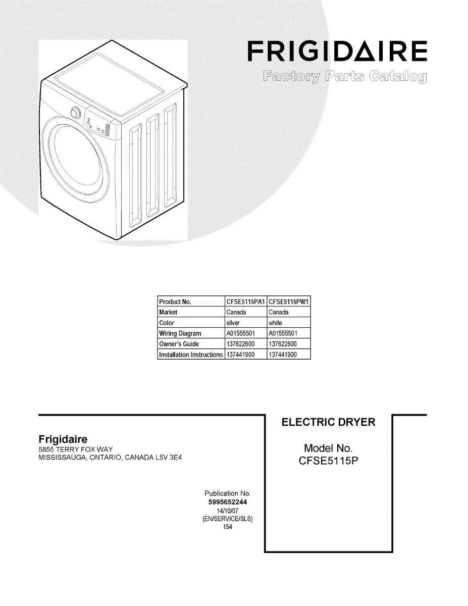 Parts for Frigidaire CFSE5115PW1: 01 - Cover Sheet Parts