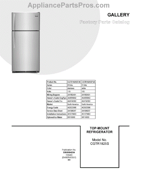 Parts for Frigidaire CGTR1825SP3A: 01 - Cover Sheet Parts