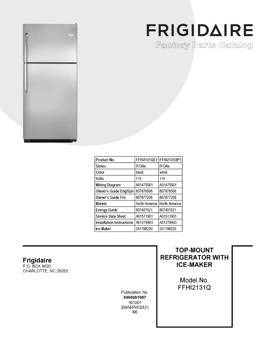 Parts for Frigidaire FFHI2131QP1: 01 - Cover Sheet Parts