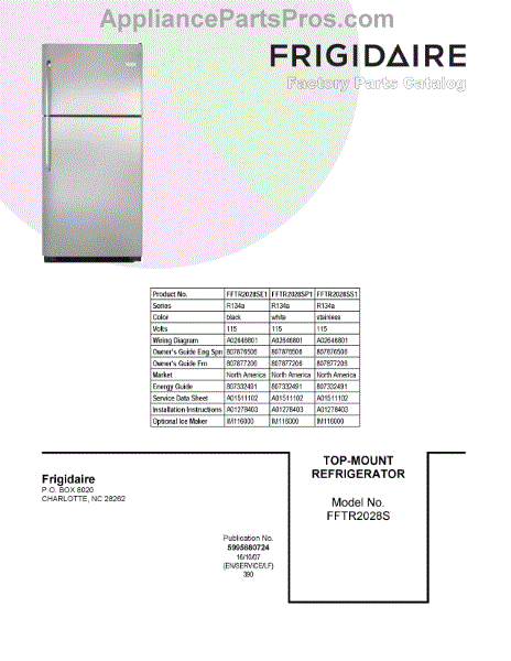 Parts for Frigidaire FFTR2028SE1: 01 - Cover Sheet Parts