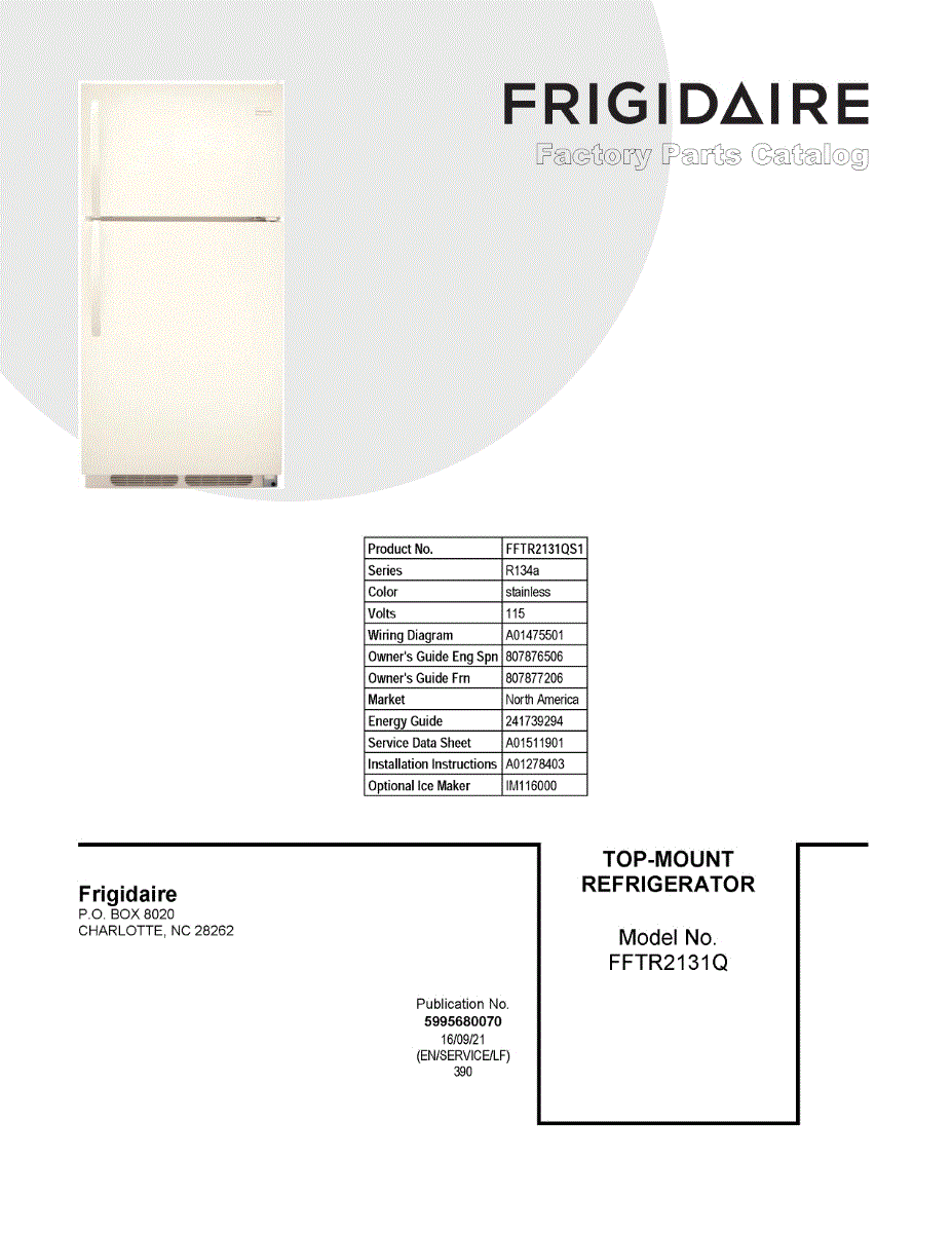 Parts for Frigidaire FFTR2131QS1: 01 - Cover Sheet Parts