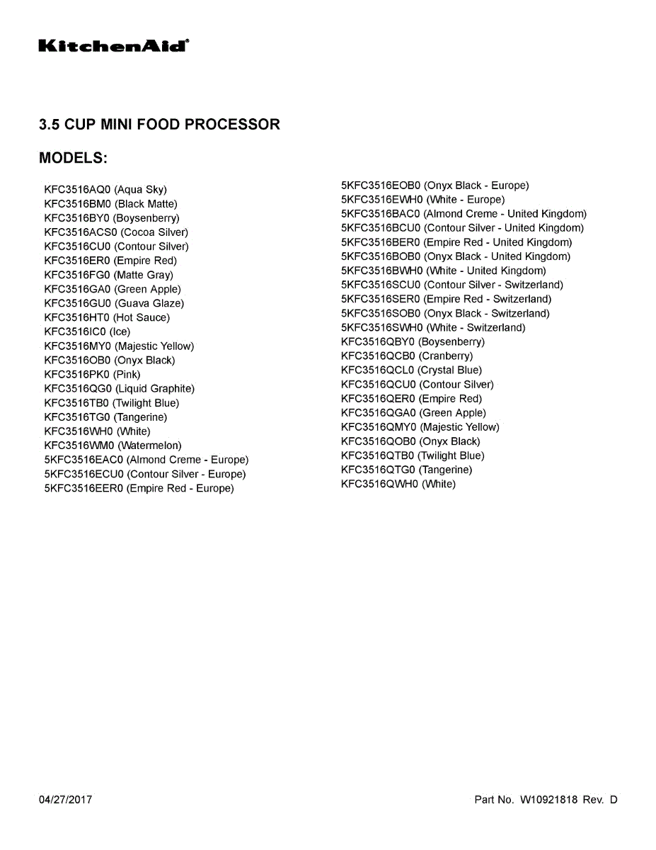 Parts for Kitchenaid 5KFC3516SOB0: 01 - Cover Sheet Parts