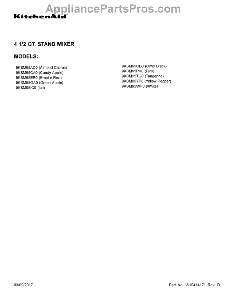 Parts for Kitchenaid 9KSM95PK0: 01 - Cover Sheet Parts