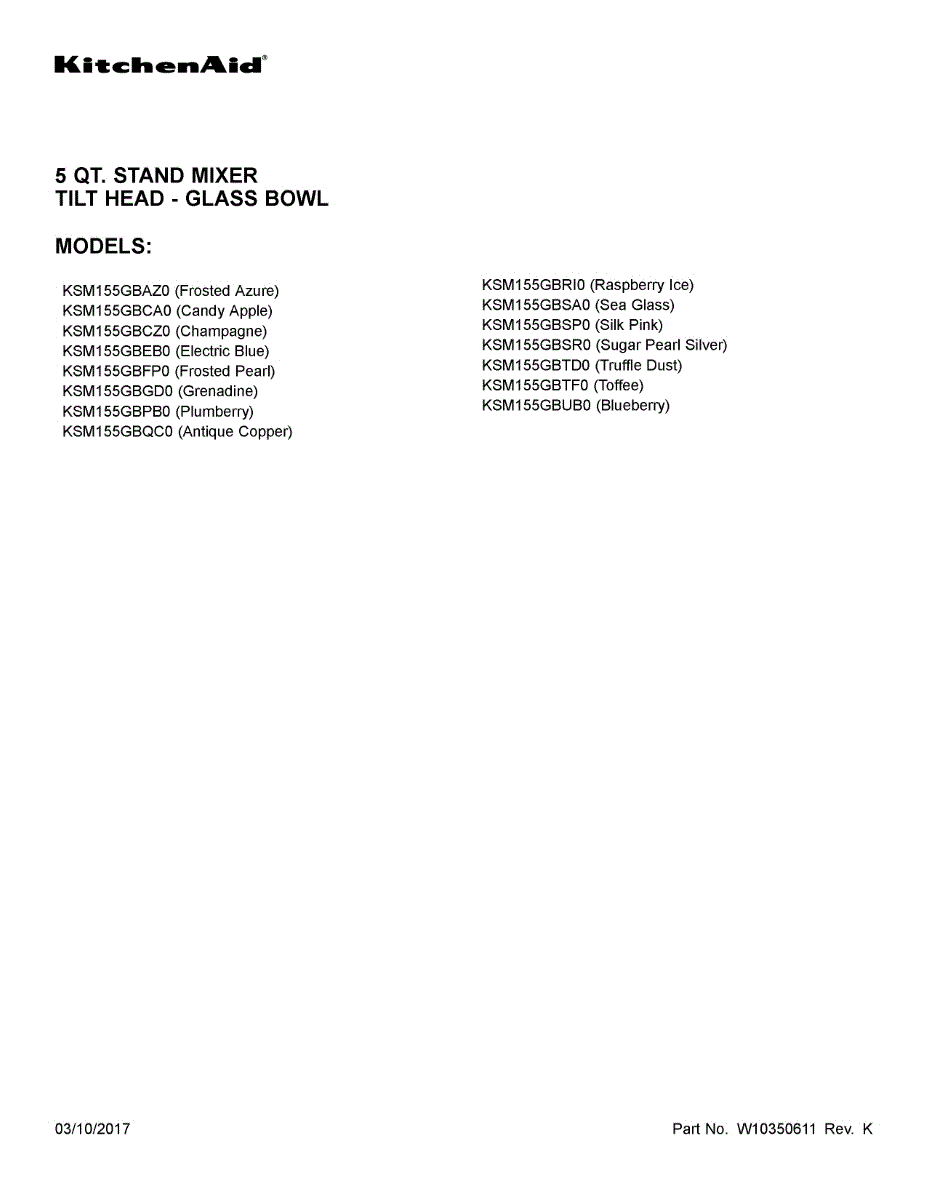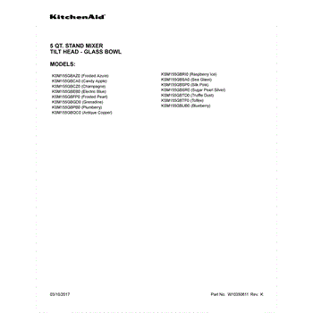 Parts for Kitchenaid KSM155GBSP0: 01 - Cover Sheet Parts