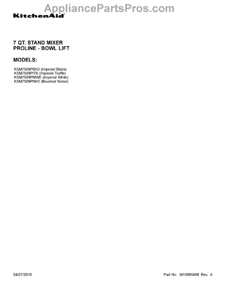 Parts for Kitchenaid KSM7589PNK0: 01 - Cover Sheet Parts