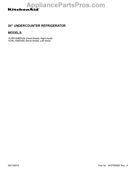 Parts for Kitchenaid KURL104EPA00: 01 - Cover Sheet Parts