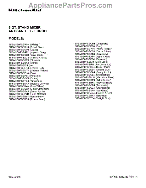 Parts for Whirlpool 5KSM150PSECZ4: 01 - Cover Sheet Parts