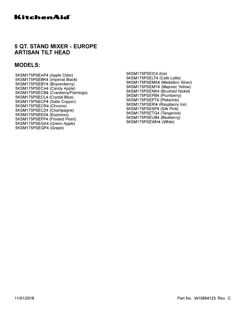 Parts for Whirlpool 5KSM175PSEPT4: 01 - Cover Sheet Parts