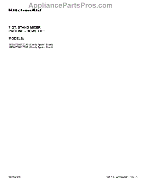 Parts for Whirlpool 7KSM7586PZCA0: 01 - Cover Sheet Parts