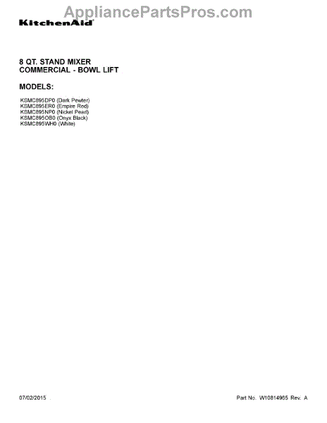 Parts for Whirlpool KSMC895ER0: 01 - Cover Sheet Parts