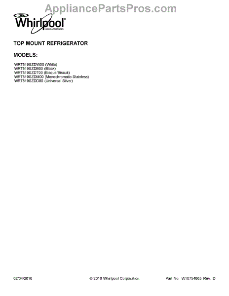 Parts for Whirlpool WRT519SZDT00: 01 - Cover Sheet Parts