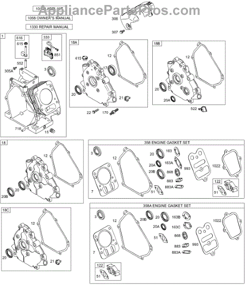 Parts for Briggs & Stratton 126412-0023-E1: Crankcase Cover / Sump, Cylinder, Kits / Gaskets - Engine Parts