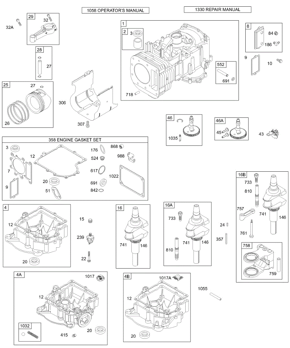 Parts for Briggs & Stratton 28N707-0128-01: Crankcase Cover / Sump, Crankshaft, Cylinder, Piston / Rings, Connecting Rod Parts