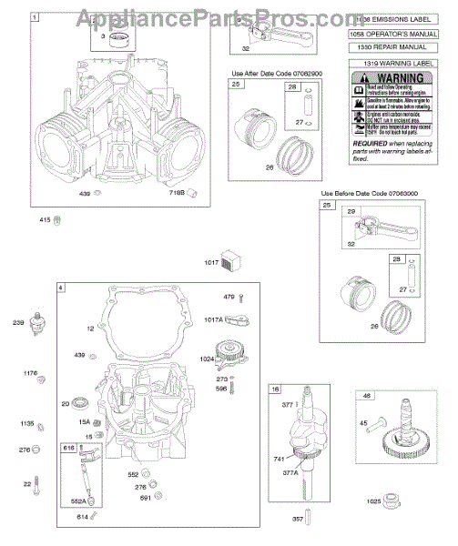 Parts for Briggs & Stratton 385777-0119-E1: Crankshaft, Cylinder, Sump, Piston / Rings / Conn Rod Parts