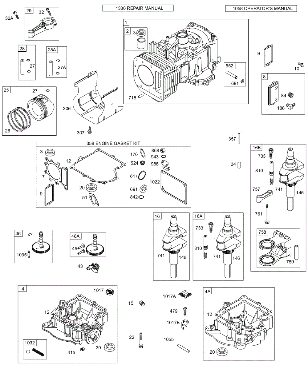 Parts for Briggs & Stratton 28Q777-0688-E1: Crankshaft, Sump, Cylinder, Piston / Rings, Connecting Rod Parts