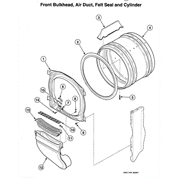 This front bulkhead assembly forms the dryer's front drum support and air seal. Replacing a worn or damaged bulkhead restores smooth drum rotation, reduces noise, and helps maintain proper airflow for consistent drying performance.