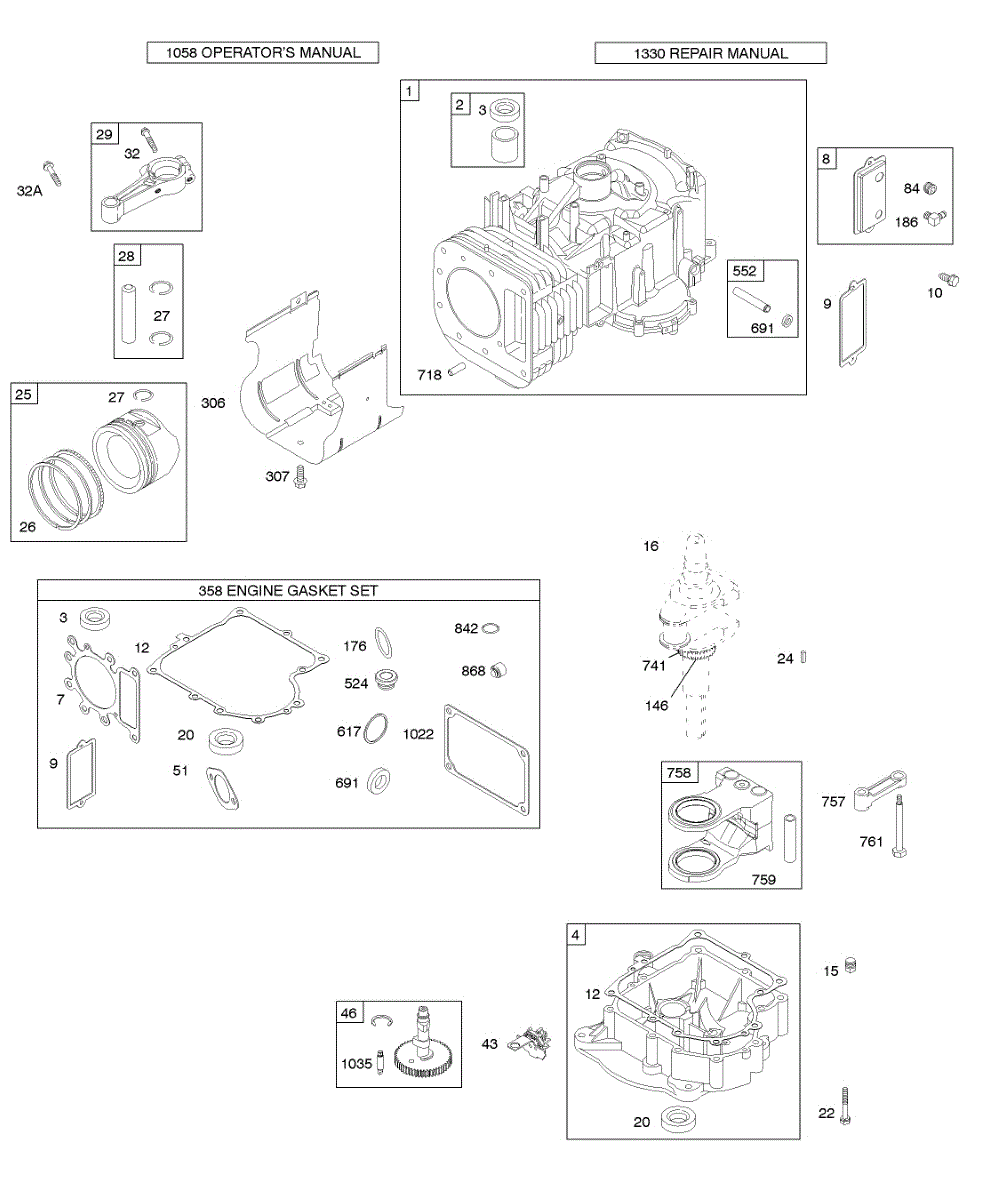 Parts for Briggs & Stratton 28U707-1129-E1: Cylinder, Crankshaft, Sump, Piston / Rings Parts