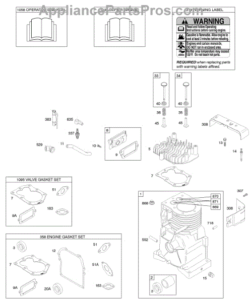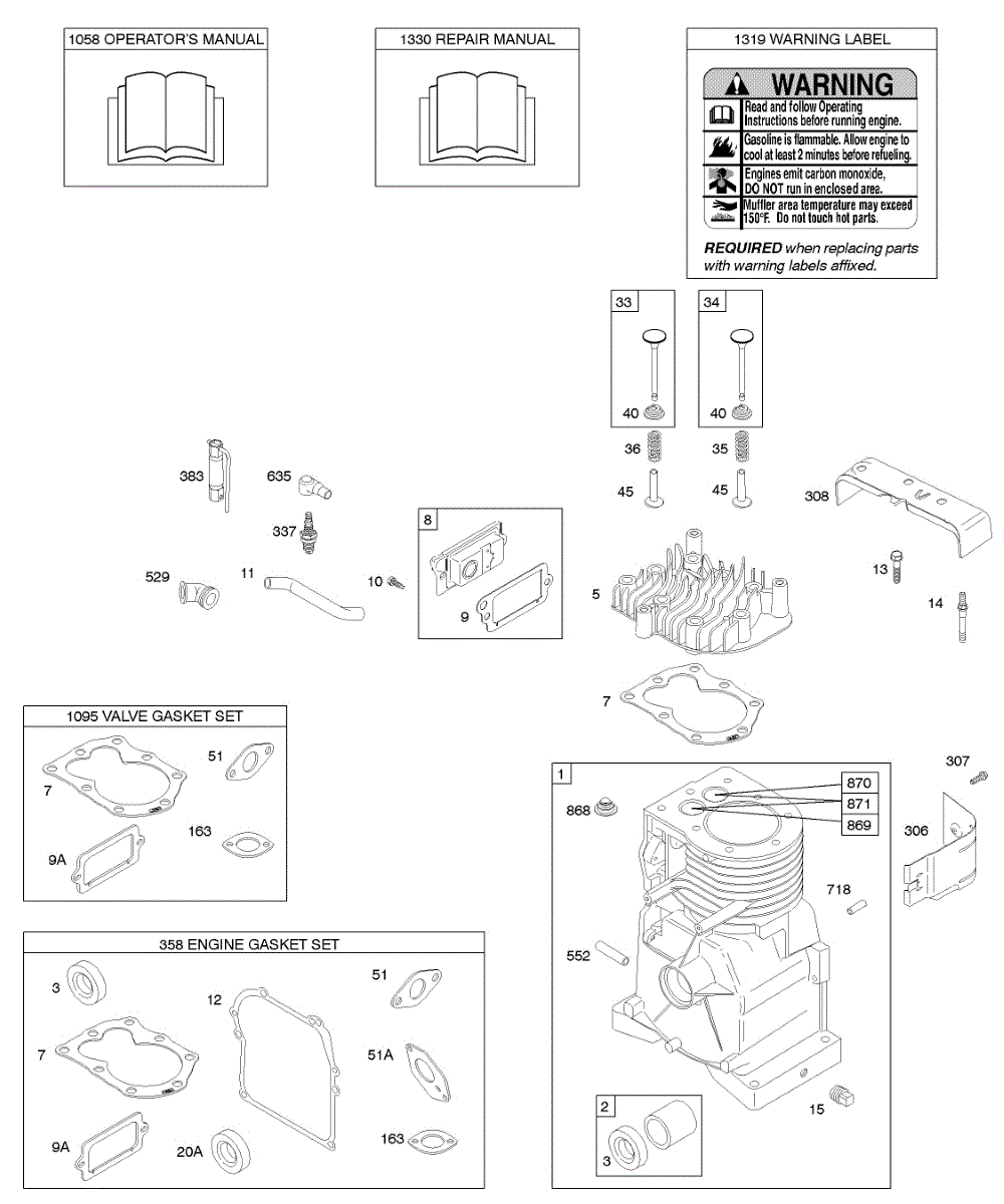 Parts for Briggs & Stratton 091412-0130-B1: Cylinder, Cylinder Head, Gasket Set - Engine, Gasket Set - Valve, Operator's Manual, Warning Label Parts