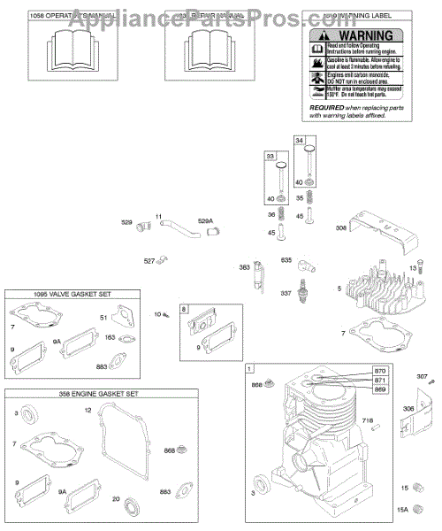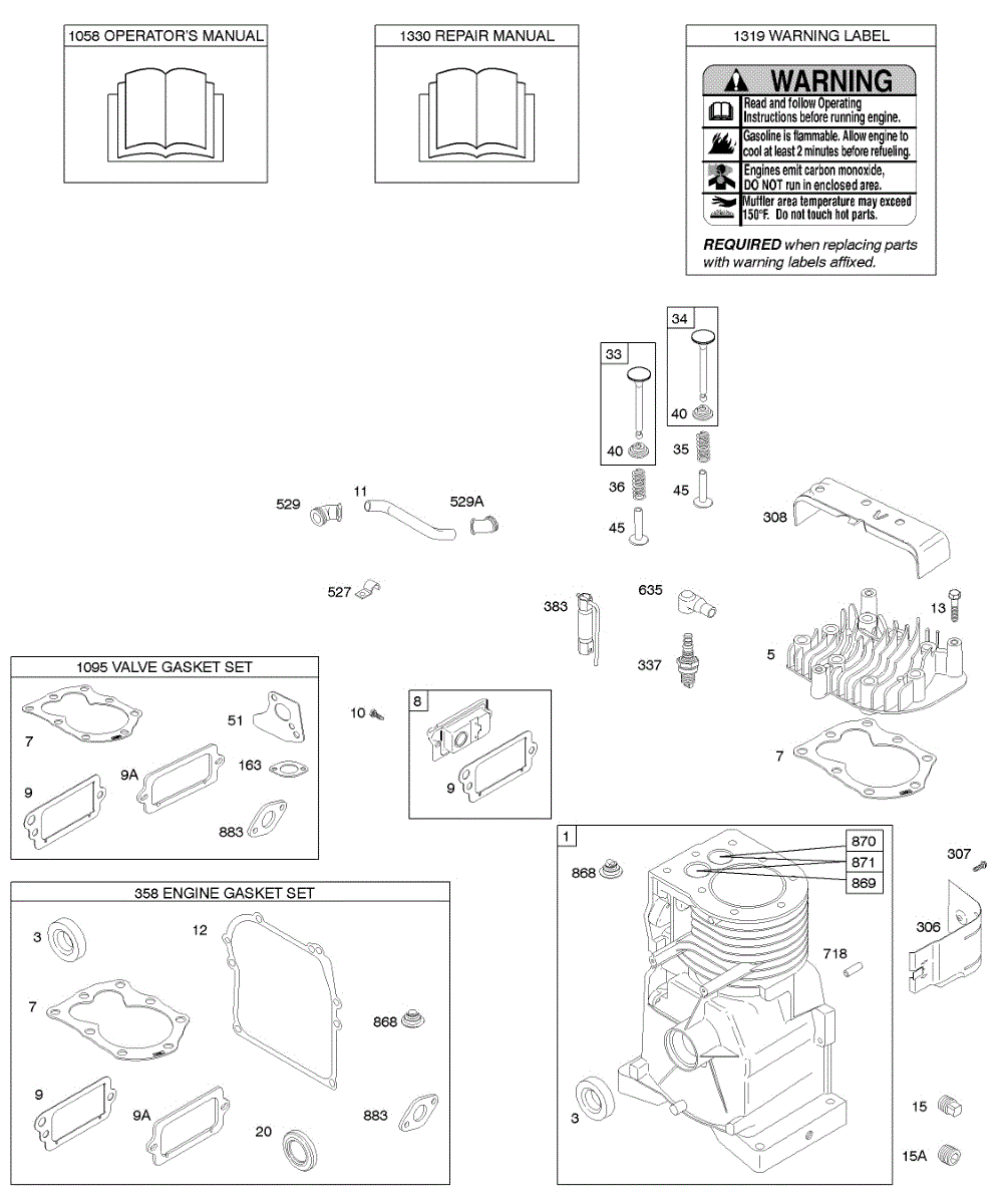 Parts for Briggs & Stratton 094212-0120-E1: Cylinder, Cylinder Head, Gasket Sets, Operator's Manual, Repair Manual, Warning Label Parts