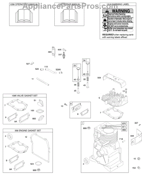 Parts for Briggs & Stratton 095212-0118-E1: Cylinder, Cylinder Head, Gasket Set - Engine, Gasket Set - Valve, Operator's Manual, Warning Label Parts
